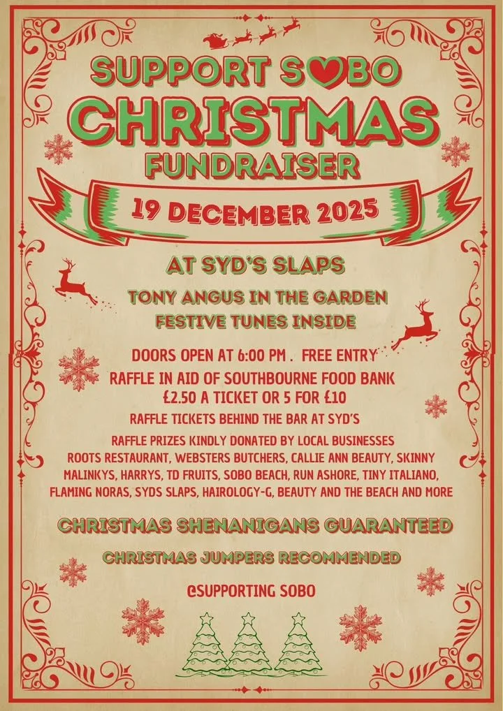In addition to the festivities on the Green, Supporting Sobo is hosting a special Christmas Fundraiser on 19th December at Syd’s Slaps.